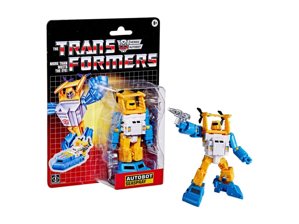 Znovu si prožijte nostalgie vašich oblíbených G1 akčních figurek s hračkou Transformers Retro Autobot Seaspray! Hračka se transformuje z robota na loď v 22 krocích. Seaspray projevuje nadšení pro svou práci, které nemá žádný z jeho kolegů Autobotů. Miluje oceán a jeho obyvatele a miluje vzrušení z námořní bitvy. Akční figurky Transformers Retro G1 se vyznačují vintage stylingem, doplňky a speciálními uměleckými obaly a technickými specifikacemi. Vyřízněte a uschovejte technické specifikace na krabici, abyste je mohli sdílet, a potom zjistěte, jak se tato figurka měří oproti ostatním hrdinským Autobotům a zlým Decepticonům. (Prodává se každý zvlášť, podléhá dostupnosti).