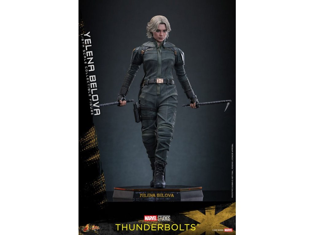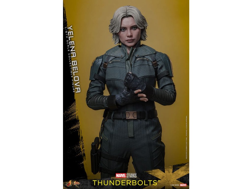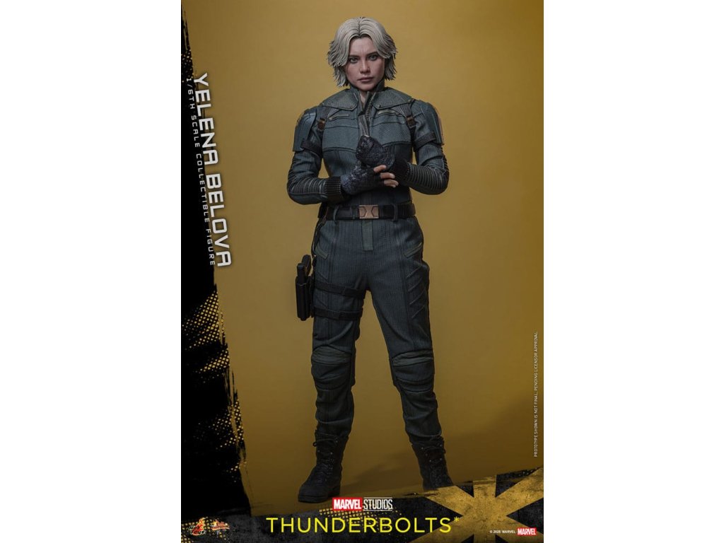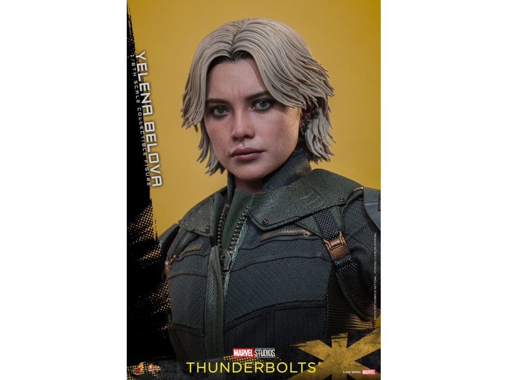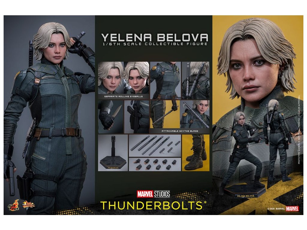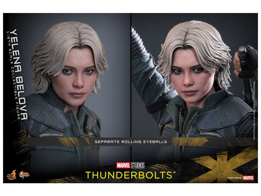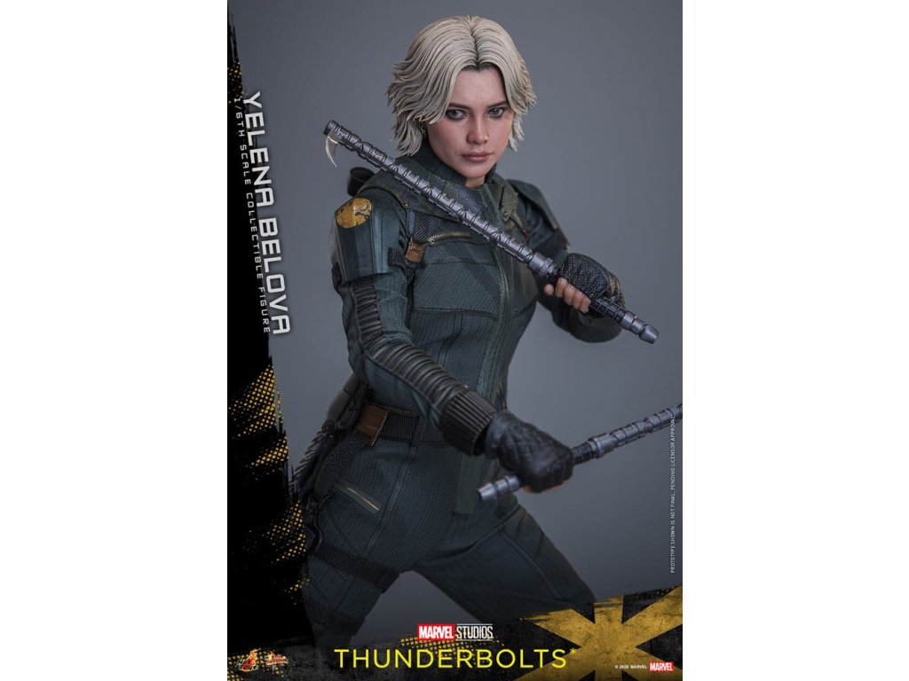 "Sami ho nezastavíme. Nikdo to nedokáže. Ale můžeme to zvládnout společně." - Jelena BělovaV Marvelových studiích Bleskovky*, Jelena Bělova vstupuje do popředí, kde plně využívá svou roli silné operativky s komplikovanou minulostí. Cesta Jeleny od vyškolené vražedkyně z Rudé komnaty k vůdci týmu Bleskovky* (Noví Avengři) ukazuje její odolnost a hloubku. Její postava se vyvíjí skrze zranitelnost, sílu a snahu o odpuštění, což z ní dělá výraznou postavu v Marvelovém filmovém vesmíru.Hot Toys je hrdý na to, že představuje sběratelskou postavičku Jeleny Bělové v měřítku šestina, první členku naší řady Bleskovky*. Tato akční postavička má nově vyvinutou hlavu s přesným filmovým výrazem, detailním make-upem a oddělenými očními bulvami. Její blond vlasy jsou přesně vypracované, zachycující podobu postavy na obrazovce. Bojový kostým Jeleny je znovu vytvořen s mimořádnou pozorností k detailům, s jednodílným taktickým oblekem s ručně šitými detaily, doplněným o ramenní brnění a typický Black Widow's Bite rukáv na obou zápěstích. Její vybavení je stejně smrtící, jako je ikonické, včetně krátkých obušků a dlouhých obušků s připojitelnými kosovými čepelemi, spolu s pistolí a bojovým nožem pro blízké souboje. S devíti vyměnitelnými rukama pro různé pózy, od uvolněných postojů po gesta připravená k akci a typické superhrdinské přistávací pózy, tato novinka nabízí neuvěřitelnou flexibilitu zobrazení pro dynamické a výrazné pózy.Sestavte Nové Avengry s touto pečlivě vytvořenou sběratelskou postavičkou Jeleny Bělové v měřítku šestina.