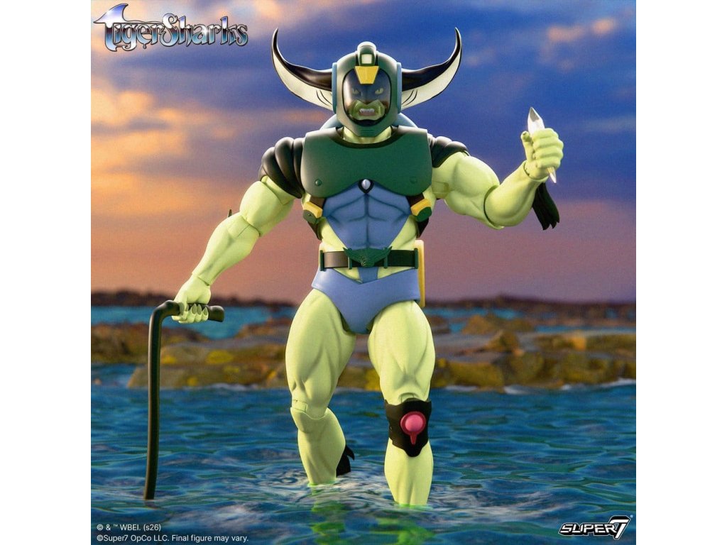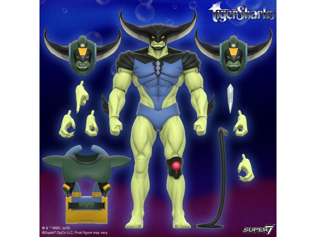 Planeta Water-O je pod útokem, protože Mantanas nemá nikdy dost své destrukce. T-Ray, vůdce Mantanas, je připravený ovládnout planetu a bojovat proti TigerSharks v podobě figurek Ultimates! Díky podrobnému modelování a prémiovým detailům laku je tato vysoce artikulovaná figurka v měřítku 7'' dokonalá pro inscenaci bitev a vytvoření oblíbených momentů ze série TigerSharks. Animovaná série TigerSharks z roku 1987 od produkční společnosti Rankin/Bass Productions sledovala dobrodružství hrdinů, kteří dokázali plavat, potápět se a zachraňovat den, proměnit se z lidí na vodní verze sebe samých, vše díky technologii Fish Tank. Tato akční figurka T-Ray je dodávána s řadou příslušenství, která mu v každé situaci dává převahu, včetně bitevních doplňků, vyměnitelných hlav a různých vyměnitelných rukou. Figurka T-Ray ULTIMATES! je dodávána v sběratelsky příjemném balení s okénkem, s uměním Super7 inspirovaných animovanou sérií. Připravte si poličku vedle akvária a rychle plavte, abyste dostali svou figurku T-Ray ULTIMATES! Příslušenství - 7 x Ruka - 2 x Pěst - 1 x Ukazovací ruka - 2 x Drápovité ruce - 2 x Otevřené ruce - 3 x Hlava - 1 x Křišťál - 1 x Dýchací přístroj - 1 x Bojový bič. Orientační datum vydání: únor 2027