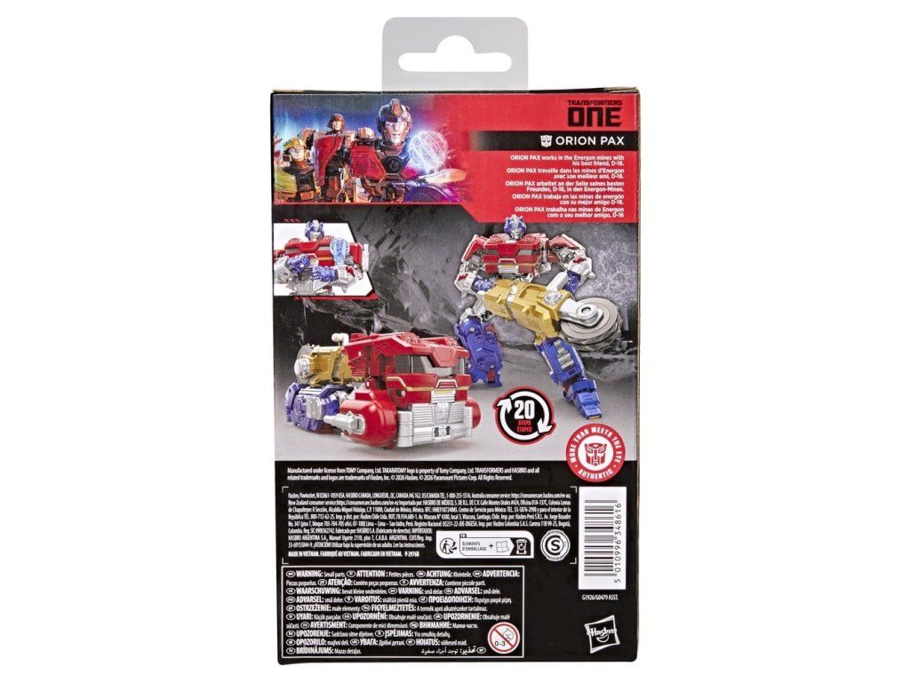 Zažijte epickou akci z filmu Transformers: One s hračkou Transformers Studio Series Orion Pax! Postavička o velikosti 12,5 cm (5 palců) se v 20 krocích přemění z robotické akční figurky do podoby cybertronského nákladního vozu. S detaily inspirovanými filmem, propracovanou možností polohování a připevnitelnými doplňky, jako je těžební pila a 'holografická' mapa, kterou lze připevnit na jeho paži, je tato akční figurka Orion Pax skvělým doplňkem každé sbírky. Nezapomeňte sledovat další sběratelské hračky Transformers (prodávají se samostatně, dostupnost se liší) s oblíbenými postavami jako Optimus Prime, Bumblebee, Megatron a dalšími, abyste vytvořili sestavu, která je – Více než se zdá.