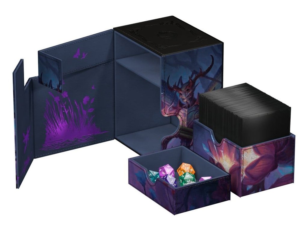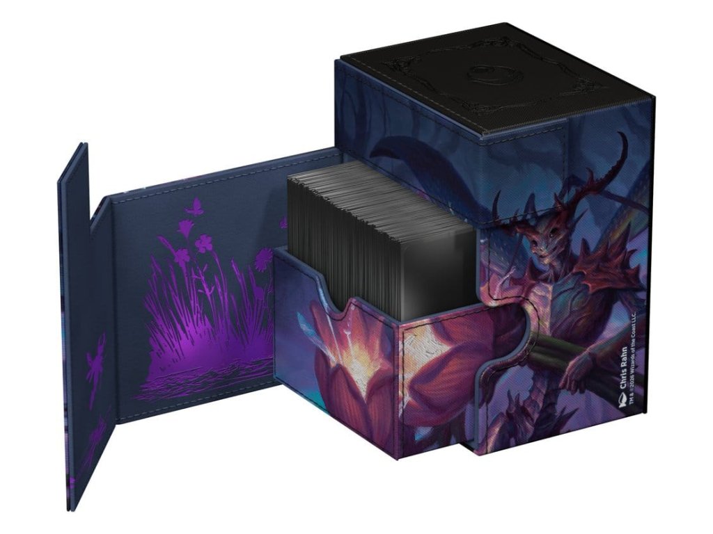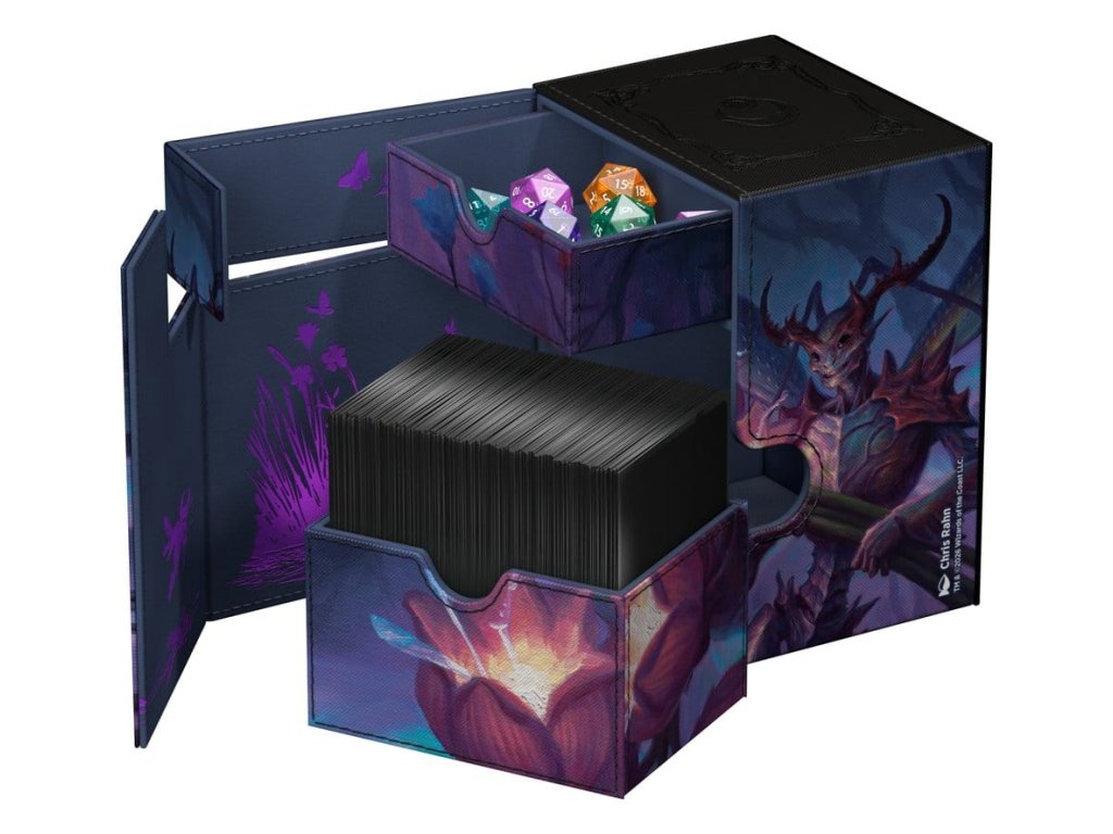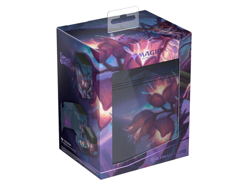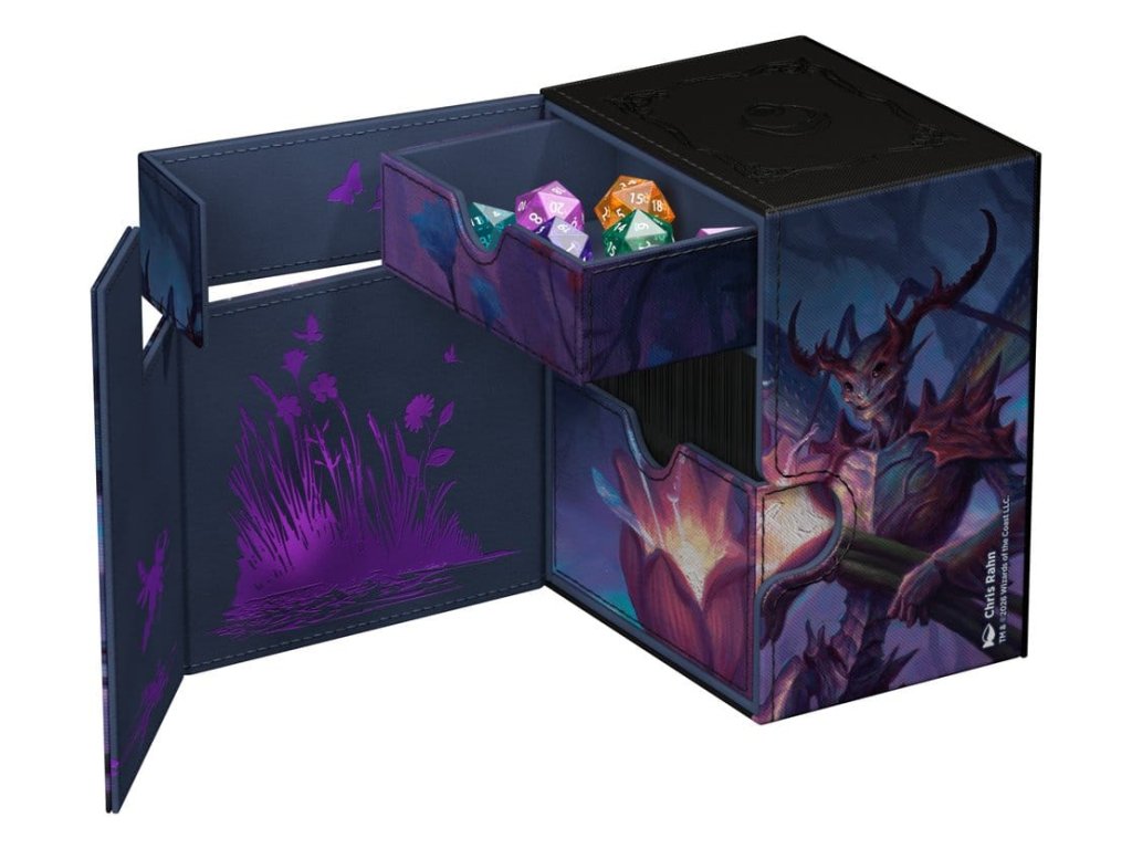 Ultimate Guard's Flip'n'Tray 100+ Xenoskin je prvotřídní krabička na karty MTG pro všechny formáty Magic (Commander/EDH, Modern, Standard atd.) s dvěma nezávisle přístupnými přihrádkami - jednou pro 100 dvojitě rukávů v rukávech Ultimate Guard* a jednou pro kostky a příslušenství. Potištěný oficiálně licencovanou grafikou z sady Magic: The Gathering "Lorwyn Eclipsed", Flip'n'Tray 100+ je vybaven odolným materiálem Xenoskin, mikrovlákenným vnitřním obložením a silnými magnetickými závěry, které garantují mimořádnou ochranu karet. Navrženo tak, aby kombinovalo s dalšími produkty Ultimate Guard, tato krabička na karty může udržet Boulder 100+, pokud je přihrádka na karty odstraněna.