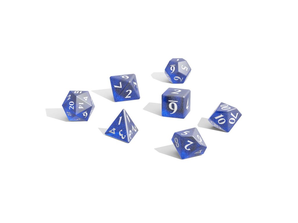 - Každý set obsahuje jedenáct blyštivých akrylových kostek ve dvoudílné průhledné úložné krabičce