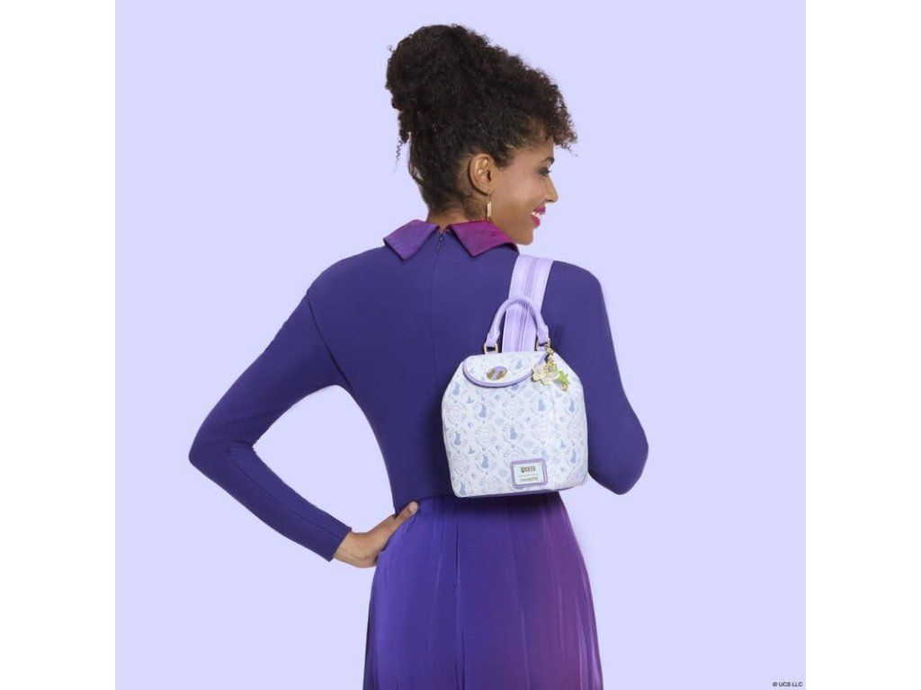 Batoh s potiskem. Vnější boční kapsy. Materiál: polyester / umělá kůže. Rozměry: 17 x 10 x 21 cm.