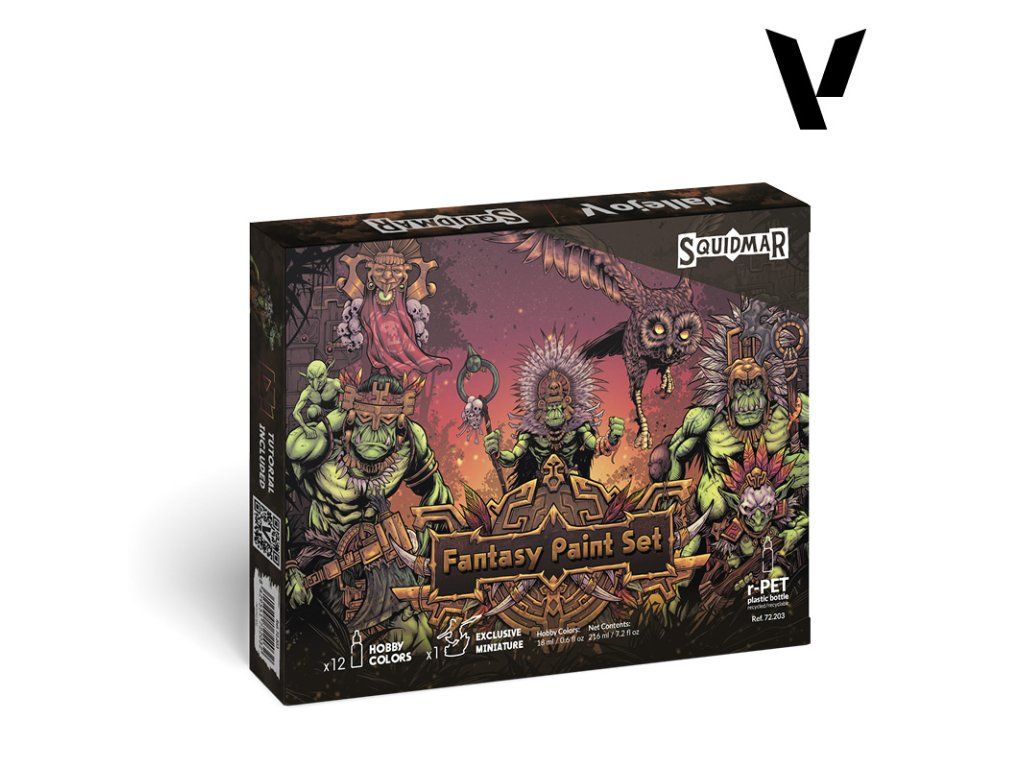 Jedinečná sada 12 akrylových barev a mini figurky Fantasy Paint Set by Squidmar od společnosti Vallejo.