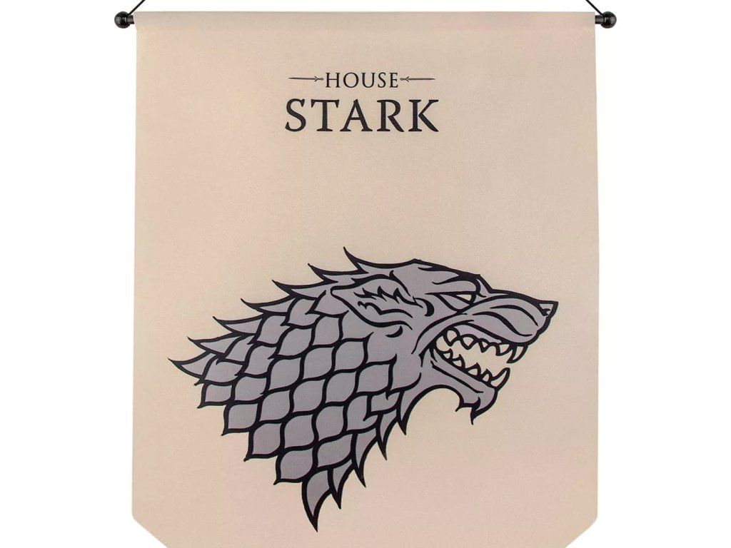 Krásná nástěnná vlajka s rodovým znakem Starků ze Hry o trůny - Game of Thrones bude jedinečnou ozdobou a dekorací vašeho domova, případně rodového sídla.