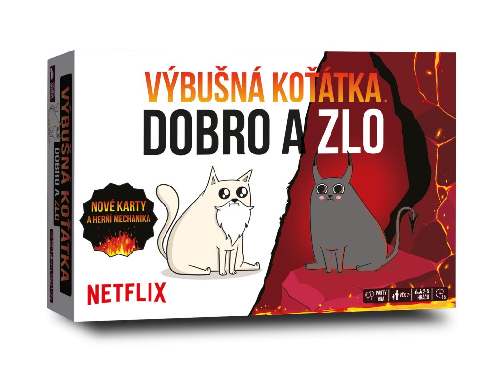 Nová pravidla. Nová koťátka. Nový zmatek. Jde o nejriskantnější verzi Výbušných koťátek, která byla vytvořena na motivy animovaného seriálu oblíbené streamovací služby Netflix.Na co se můžete těšit? Samozřejmě na pořádnou porci skvělé zábavy a na ultimátní boj dobra a zla, který spouští zbrusu nová karta Armagedon za přítomnosti Ďábelské a Boží kočky! A kdo by rád zakusil trochu řízeného hazardu, pro toho tu je Čertovina. Na své si přijde prostě každý škodič i andílek!