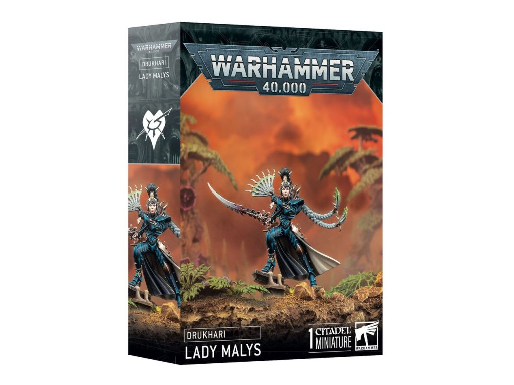 Lady Malys je nový plastový model od Games Workshop pro frakci Drukhari. Kit nabízí dvě varianty hlavy — jedna s poloviční závojem a druhá s odhaleným obličejem — což umožňuje přizpůsobení vzhledu. Součástí balení jsou také dva rozdílné scenic base toppers (základní dekorativní prvky podstavce). Model je dodáván nesestavený a nenabarvený (vyžaduje montáž)