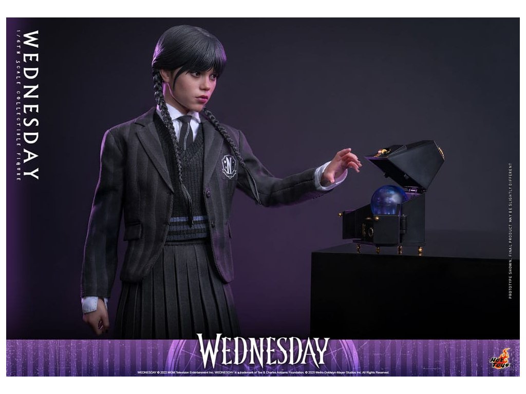 Sideshow a Hot Toys s hrdostí představují sběratelskou figurku Středy ve škále 1/6, inspirovanou nezapomenutelným podáním Středy od Jenny Ortega z Netflix serie Středa. Tato akční figura má precizně vyrobenou hlavu s odděleně otáčecími očima, pečlivě tvarovaný černý vlasový model s detaily copánků a výrazem obličeje, strukturou pleti a make-upem, který zachytává typický nevzrušený šarm Středy. Figurka má nově vyrobené tělo, je vysoká přibližně 27 cm a má 25 artikulačních bodů, které replikují její tělesnou stavbu ze seriálu. Přichází s osmi nově vyrobenými vyměnitelnými rukama pro různé expresivní pózy, od její ikonického cvaknutí prstů až po držení různých doplňků. Postava šesté škály je oblečena v přesně ušité uniformě Akademie Nevermore, včetně pruhovaného saka s magnetickými ramenními prvky, svetru, košile, kravaty, pruhované plisované sukně, punčoch a bot. Sada obsahuje řadu doplňků, včetně batohu, deštníku, violoncella s kokou, židle, sledovacího zařízení, křišťálové koule s pouzdrem na nošení a deníku Společnosti Nightshade s prorockou kresbou Středy Adamsové a Josepha Crackstonea. Neschází ani Ruka, kterou nelze přehlédnout a která přichází jako doplněk ve třech různých stavech, včetně běžného stavu, gesta cvaknutí prsty a gesta palec nahoru. Je také magneticky připojitelný na ramena Středy pro dynamické možnosti zobrazení. Speciálně navržený okrouhlý figurkový stojan s motivem kamenné podlahy a logem Středy dokončuje tuto temnou prezentaci, což činí tuto figurku nezbytným sběratelským kusem pro všechny fanoušky Středy.