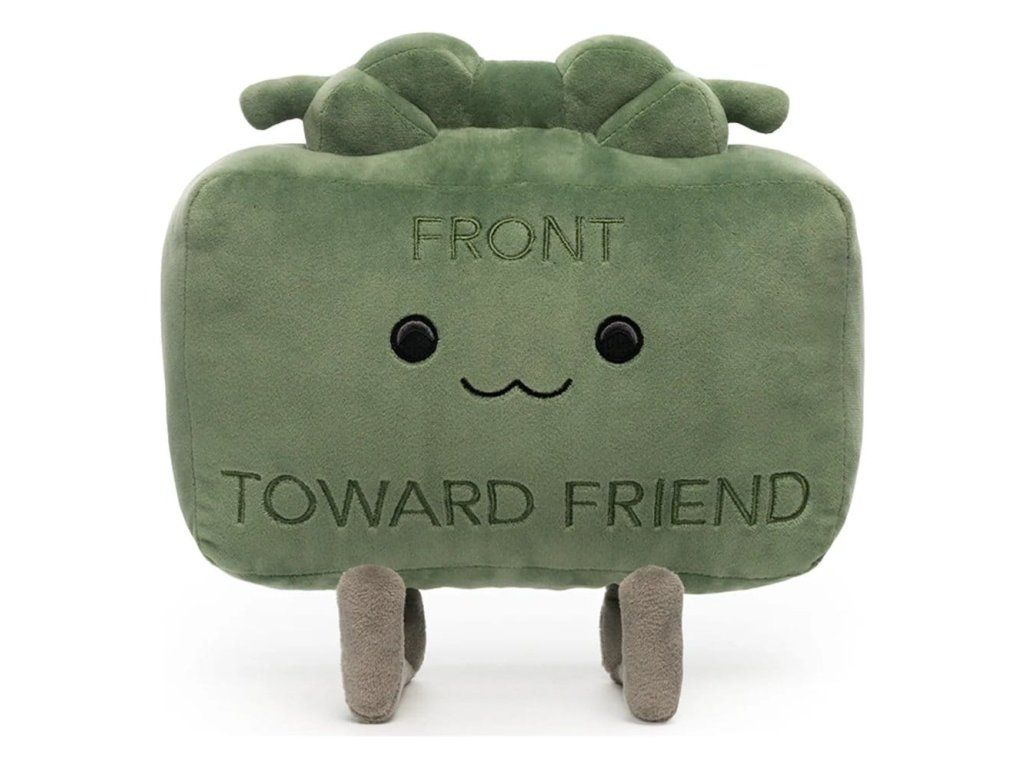 Rozložená do délky 22 cm, s dlouhýma nohama a šedýma tlapkama vystrčenýma dopředu. Uprostřed jejího nápadně zeleného těla — které má krátké špičaté uši a nese nápis 'Front Towards Friend' — spočívá nejšťastnější malý úsměv a kulaté černé oči. Tento plyš je naplněný až po okraj 100% PP vatou a je vyroben z nejměkčího minky materiálu, absolutně ideální k mazlení nebo k postavení přímo před vaše přátele.