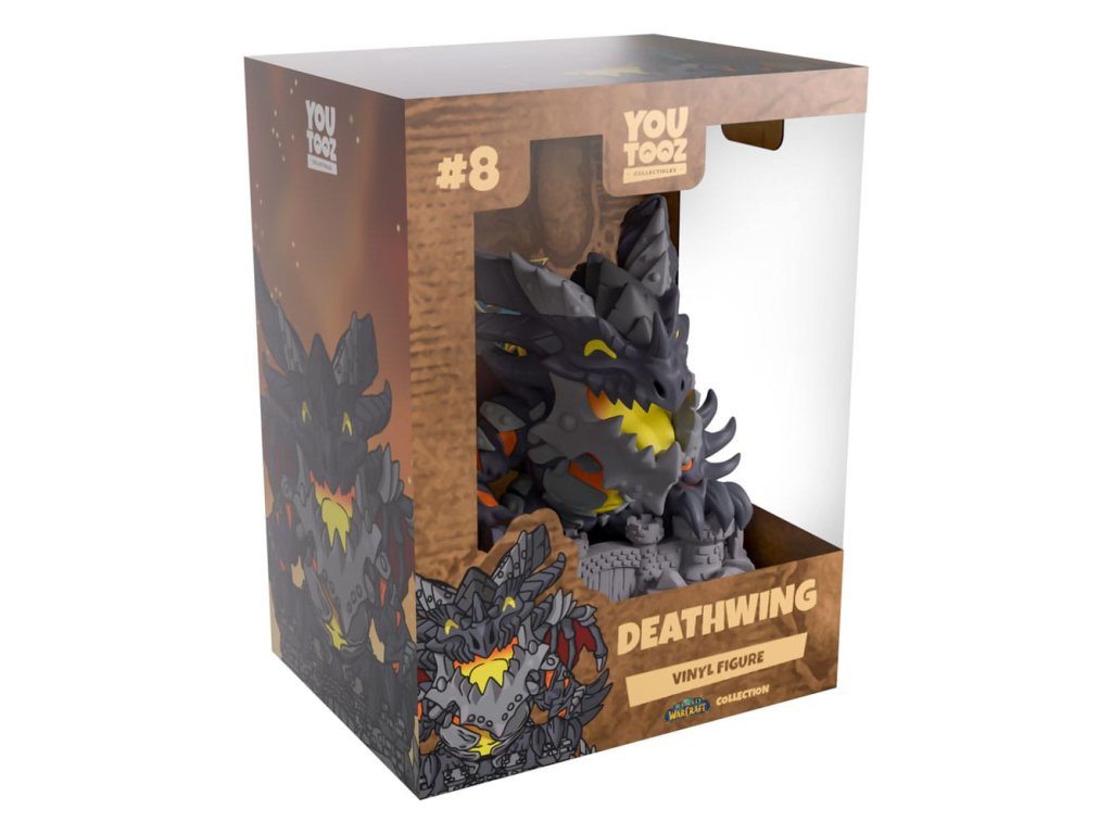 Máte chuť na trochu ničení světa? Deathwing je připravený na svůj další dobytí, figurek Youtooz! Tato figurka je vysoká 4 palce a byla navržena tak, aby zobrazovala Deathwinga, jak se tyčí nad hradními zdmi se svými ostrými drápy opřenými o jejich kulaté věže. Jeho žlutá a oranžová kůže mezi brněným hrudníkem a břišními svaly září, jako by plameny uvnitř byly připraveny vybuchnout, zatímco brněný ocas se vinul po stranách hradních zdí pod jeho rozepjatými křídly s hlubokou červenou membránou mezi kostmi. S otvorenou mocnou čelistí, která usměvavě odhaluje žlutý a oranžový ústa, dlouhé rohy se kroutí zpět od jejich hlavy. Vnější obal jejich balení je ilustrován stínovým siluetou Deathwinga letícího nad soutěskou mezi klidnými krajinami. Zatímco interiér a ochranný obal krabice ukazuje design ikonických map Azerothu, přičemž jejich figurka je vidět skrze velké průhledné okno na přední straně. Tato sběratelská figurka je zasílána v matném, reliéfním, ochranném vnějším obalu a v plastovém obalu přizpůsobeném velikosti pro maximální ochranu během přepravy. O hře World of Warcraft:World of Warcraft, neboli WOW, je MMO hra od Blizzard Entertainment, která byla vydaná v roce 2004. Jako jedna z nejpopulárnějších MMO her všech dob s odhadovaným počtem 120+ milionů aktivních hráčů, jsou říše WoW vždy připravené na dobrodruhy, ať už nové nebo staré!