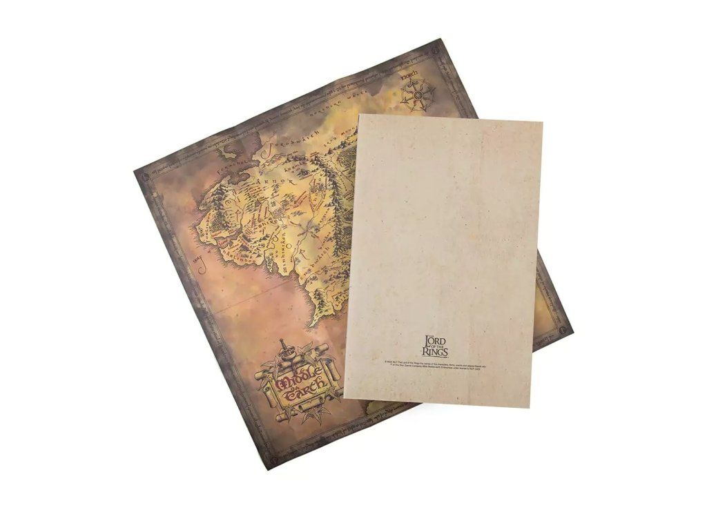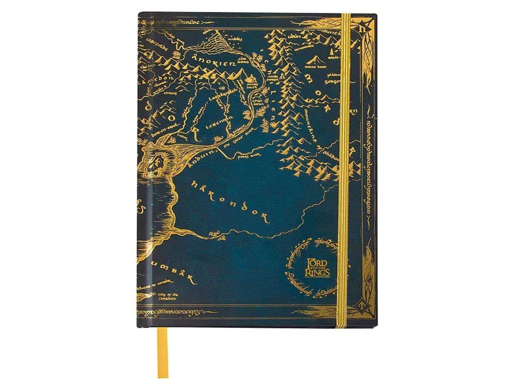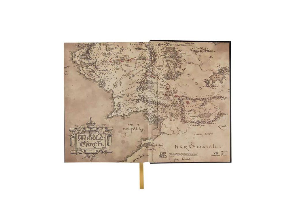 Krásný linkovaný zápisník v pevných deskách pro všechny fanoušky fantasy trilogie Pán prstenů s bonusem v podobě mapy Středozemě. Součástí zápisníku je záložka, uzavírá se pomocí gumičky. Rozměry rozložené mapy jsou 40 x 40 cm.