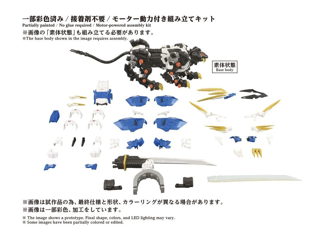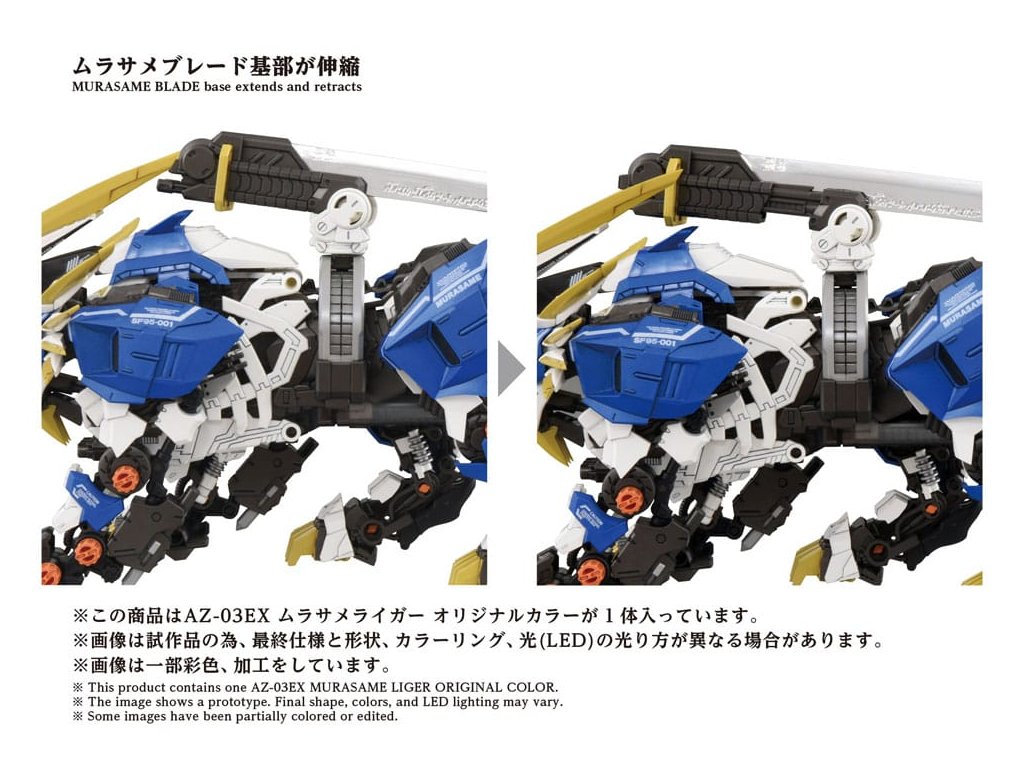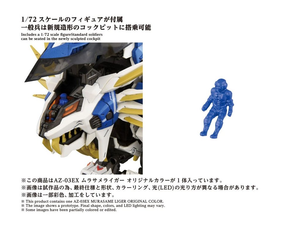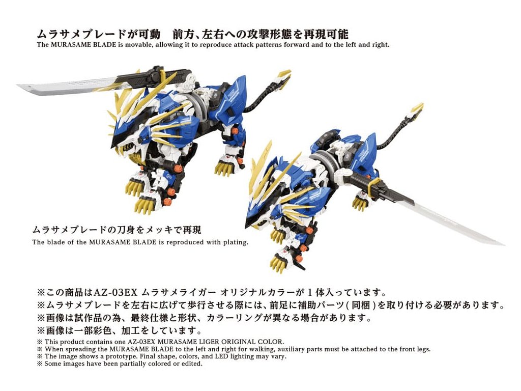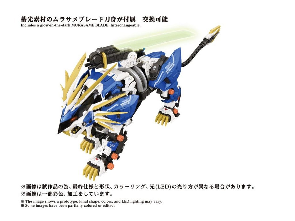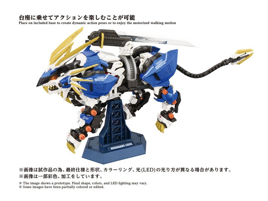 ?Pokročilý stavebnicový set série Zi?Moving, který představuje krok směrem k další evoluci, pokroku obecného smyslu. Špičková značka, která v sobě obsahuje konečnou formu stavebních setů, včetně 'rekonstrukce', 'zlepšení' a 'zušlechťování' na základě témat stanovených pro každého Zoida. Montážní set v měřítku 1/72. Po aktivaci elektrické jednotky se vytváří realistický pohyb zvířat, s LED osvětlením v očích a hrudi. Části, jako je hromadný bunkr, jsou manuálně pohyblivé. Murasame Blade, nejvyšší zbraň Murasame Liger, přichází s oběma, pokovenou i fosforescentní verzí, pro výměnné použití. Murasame Blade se volně pohybuje dopředu, dozadu, doleva a doprava. Jeho základna má rozšiřitelný mechanismus, který dále rozšiřuje možnosti pózování. Součástí je i figurka pilota v měřítku 1/72 (voják), který může být posazen do kokpitu (není nabarven). Po připevnění na přiloženou základnu si můžete užít jeho chůzi přímo tam. * Vyžaduje AAA alkalické baterie X 2 (prodávají se samostatně). Orientační datum vydání: září 2026